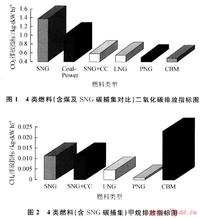 3) 在天然氣聯(lián)合循環(huán)發(fā)電為能源終端的情況下,SNG、SNG+CC(SNG工廠階段進(jìn)行碳捕集)、LNG、PNG及CBM全生命周期的C02的排放比例為2.90:1.20:1.12:1:1;CH4的排放比例為0.48:0.48:0.20:0.32:1。由于無(wú)法取得LNG部分階段的N2O指標(biāo),但相關(guān)資料顯示LNG與常規(guī)天然氣全生命周期的N20排放指標(biāo)基本相同。因此,對(duì)應(yīng)于上述5類能源形式的N2O排放比例為1.11:1.11:0.97:O.97:1。