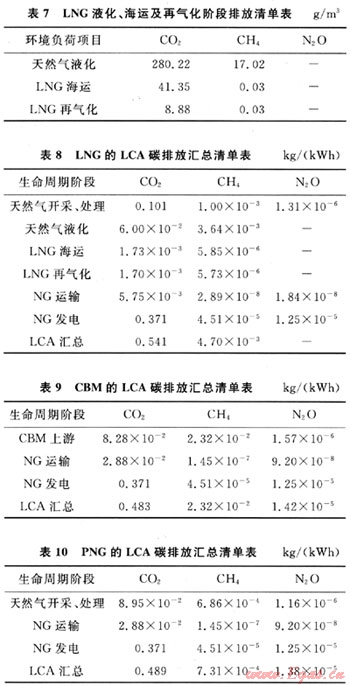 考慮到實(shí)際情況和可比性,LNG氣化后的運(yùn)輸距離按200km考慮,CBM和PNG仍按1000km的運(yùn)距。由此可以按統(tǒng)一基準(zhǔn)編制出LNG、CBM、PNG的LCA碳排放匯總清單,見(jiàn)表8~10。
