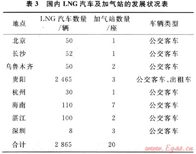 目前國內(nèi)只有北京、烏魯木齊、長沙、貴陽、海南等城市和地區(qū)進行了LNG汽車技術(shù)示范應(yīng)用,并主要局限在公交車領(lǐng)域的應(yīng)用。據(jù)調(diào)查,截止到2009年12月全國僅有2800余輛LNG汽車運行,已建成的部分LNG加氣站情況如表3所示。