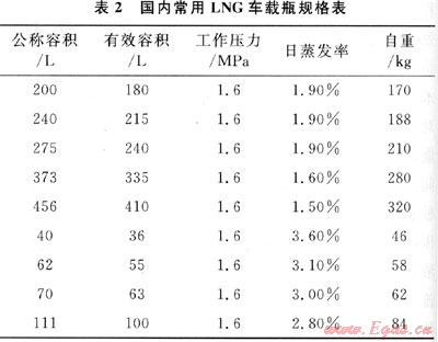 作為汽車燃料,LNG較CNG具有以下優(yōu)勢:①燃料雜質(zhì)少、純度高(個別LNG中甲烷含量能達到99%)、精純的LNG燃燒更徹底,使發(fā)動機性能充分發(fā)揮,排放更加潔凈;②CNG汽車相對于汽油和柴油汽車而言,動力性下降5%~15%,而電噴式LNG汽車相對于汽油和柴油汽車,動力降低不到2%[2];③LNG儲罐為常壓低溫絕熱容器,比CNG高壓鋼瓶壓力要求低,自重降低很多;④LNG常壓使用,防撞、抗爆性好,LNG汽車較CNG汽車更安全;⑤由于燃料儲箱體積小,重量輕,燃料能量密度大,相應(yīng)提高了汽車裝載利用率[3],LNG汽車?yán)m(xù)駛里程約為CNG汽車的3倍,可超過400km。