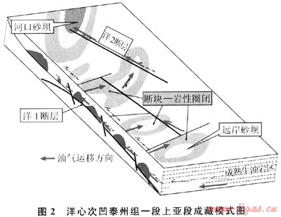 油氣成藏研究表明,白駒凹陷洋心次凹洋1、洋2、洋3等北西-南東向的斷層是在泰州組,阜寧組沉積完以后發(fā)育,三垛運(yùn)動(dòng)定型,其對(duì)泰一段上亞段的砂體沉積不起控制作用。但洋1斷層貫穿緩坡帶上的多個(gè)小砂壩,并與成熟生油區(qū)相連接,它將成熟生油區(qū)生成的石油,通過(guò)與其形成輸導(dǎo)網(wǎng)絡(luò)的次級(jí)斷層和砂體運(yùn)移到各個(gè)有利圈閉中,形成油藏,是開(kāi)陽(yáng)等油藏的主要油源的運(yùn)移通道。現(xiàn)有的白駒油區(qū)已發(fā)現(xiàn)的油藏均屬此類。