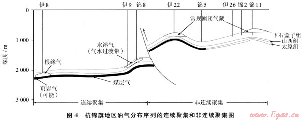 受烴源巖分布范圍、生烴史、儲(chǔ)層砂體展布規(guī)律、圈閉發(fā)育情況、斷裂活動(dòng)期次及儲(chǔ)層最終致密化時(shí)間的影響,該區(qū)主要發(fā)育兩種不同的聚集類型,連續(xù)聚集(煤層氣或頁(yè)巖氣、根緣氣、水溶氣)和非連續(xù)聚集(常規(guī)圈閉氣藏),主體上分別分布在南部和北部地區(qū)。
