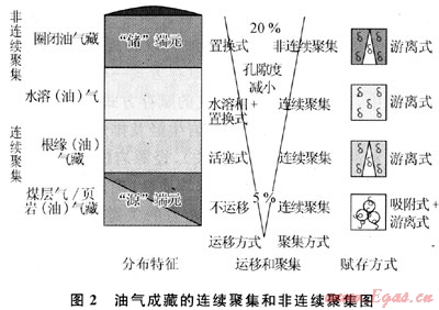 非連續(xù)聚集是指依靠浮力運(yùn)移,聚集在分散圈閉(構(gòu)造、地層、巖性)中的油氣藏,有明顯的邊底水和油水、氣水界面,主要受浮力和毛細(xì)管壓力(蓋層)所控制,連續(xù)油氣柱高度和蓋層物性是成藏動(dòng)力平衡的主要影響因素[9]。非連續(xù)聚集主要形成常規(guī)圈閉油氣藏,是目前勘探開發(fā)最多的一類油氣藏,油氣聚集于孔滲條件較好的圈閉高部位,且油氣藏與烴源巖明顯分開,一般有一定的距離,油氣和地層水的分布服從重力分異原理。