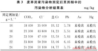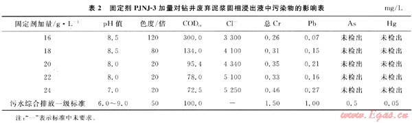 表2數(shù)據(jù)表明:隨著固定劑PJNJ-3的加入,廢棄泥漿分離出的固相物浸出液中主要污染物COD和色度在降低,總Cr和Pb的濃度略有增加,但不明顯,當(dāng)加量達到20g/L以上時,浸出液中各項污染物指標(biāo)均能滿足污水綜合排放一級標(biāo)準(zhǔn)要求。