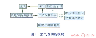 我公司研發(fā)的燃?xì)獗砉δ苣K組成見圖1。中央控制單元是該燃?xì)獗淼暮诵?。通過Ic卡讀寫單元,使用異常流量參數(shù)IC設(shè)置卡或無線形式將燃?xì)猱惓A髁繀?shù)傳入燃?xì)獗淼闹醒肟刂茊卧?,通過中央控制單元保存到數(shù)據(jù)儲(chǔ)存單元中,作為異常流量的判斷依據(jù)。當(dāng)前的瞬時(shí)流量數(shù)據(jù)從基表通過機(jī)電轉(zhuǎn)換傳感器讀入到中央控制單元后,由中央控制單元計(jì)算出當(dāng)前表內(nèi)的瞬時(shí)流量值并與數(shù)據(jù)儲(chǔ)存單元中的異常流量參數(shù)范圍進(jìn)行比較。當(dāng)確認(rèn)流量異常時(shí),中央控制單元發(fā)出關(guān)閥操作信號(hào)給閥門,閥門關(guān)閉,同時(shí)向顯示器輸出異常流量信號(hào),顯示器顯示異常提示[1]。
