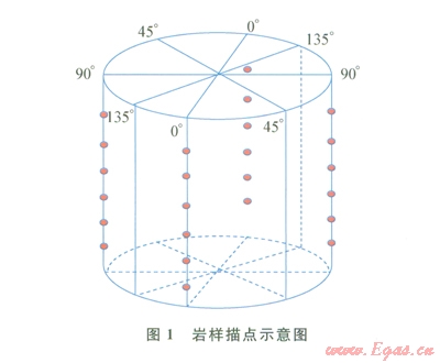 選取渝東南下志留統(tǒng)龍馬溪組露頭巖樣,通過巖樣軸心逆時針作0°,45°,90°,l35°共4條過原點的直線,并延長至徑向,再根據(jù)巖樣的長度在軸向做間隔相等的5~10個點(圖1)。接下來,用縱波探頭測量巖樣各點的縱波時差。最后,選擇徑向縱波時差相差不大的大巖樣(可近似為橫向各向同性的模型)作為研究取心對象。