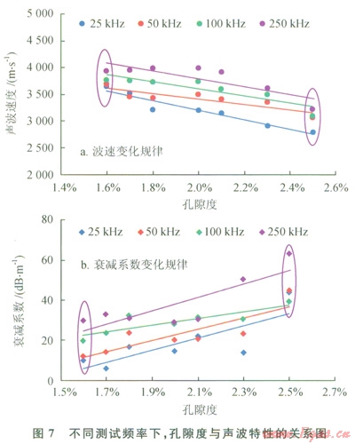 2.2.3不同測試頻率下,孔隙度對聲波特性的影響