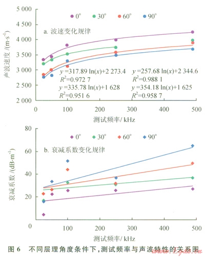 實驗結(jié)果表明,隨著測試頻率增加,聲波波速也增大,并且呈對數(shù)正相關(guān)性(圖6-a),頻散現(xiàn)象明顯,在不同層理角度條件下的各組巖心統(tǒng)計結(jié)果非常吻合,具有很強的規(guī)律性。而聲波衰減系數(shù)隨著測試頻率的增加總體也呈增大的趨勢(如圖6-b),但是變化幅度規(guī)律性不強,同層理角度條件下的各組巖心統(tǒng)計結(jié)果相近。該結(jié)果對于儲層評價中聲波參數(shù)的選擇具有一定的指導(dǎo)意義。