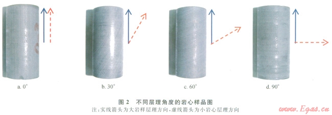 在此基礎(chǔ)上,分別沿平行層理方向(圖2-a)、與對稱軸呈一定角度(30°、60°,如圖2-b,2-c)、垂直于平行層理方向(圖2-d)進行小巖心鉆取,利用鉆機控制層理角度誤差小于5%,為了不影響測試效果,所切制樣品直徑均在1英寸左右(25.4mm),長度介于37.87~51.11mm,兩端面磨平拋光。
