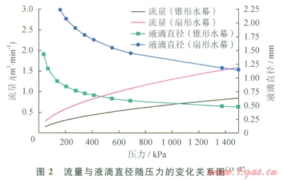 以直徑0.0508m(2in)的管道為例,流量和水滴直徑隨壓力的變化關(guān)系,如圖2所示。
