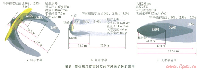 將扇形水幕、矩形水幕和無(wú)水幕3種情形進(jìn)行對(duì)比(圖5),在相同的泄漏條件和大氣條件下,LNG蒸氣云擴(kuò)散的安全距離(體積濃度為2.5%的最遠(yuǎn)擴(kuò)散距離[15])分別為13.2m(扇形水幕)和32.0m(矩形水幕),與無(wú)水幕條件下的氣體擴(kuò)散距離相比,扇形水幕將安全距離減小了83.9%,矩形水幕將安全距離減小了61.0%,就體積濃度2.5%的影響范圍而言,扇形水幕將影響范圍減小了78.4%,而矩形水幕減小了67.4%,在相同壓力、相同流量條件下,扇形水幕對(duì)LNG擴(kuò)散氣體的阻擋效果優(yōu)于矩形水幕。