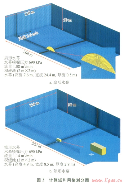 對(duì)比相同壓力、相同流量下的扇形水幕與矩形水幕,根據(jù)表1中兩種水幕的壓力和流量,兩個(gè)錐形水幕的流量與一個(gè)扇形水幕的流量近似相等,并可以近似地看成一個(gè)矩形水幕。對(duì)于上述泄漏場(chǎng)景下的擴(kuò)散情形,分別采用扇形水幕和矩形水幕進(jìn)行阻隔氣體,筆者對(duì)兩種水幕進(jìn)行CFD模擬計(jì)算,計(jì)算域和網(wǎng)格劃分如圖3所示。由于計(jì)算域?yàn)閷?duì)稱區(qū)域,所以為了節(jié)省計(jì)算資源,縮短計(jì)算時(shí)間,求解時(shí)僅對(duì)計(jì)算區(qū)域的一半進(jìn)行計(jì)算[14]。