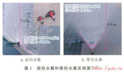 在LNG場(chǎng)站消防系統(tǒng)中,經(jīng)常會(huì)用到兩種噴射水幕,即扇形水幕(Flat Fan Spray Water Curtain)和錐形水幕(Cone Spray Water Curtain) [8,10](如圖l)。對(duì)于扇形噴射水幕的形成,工業(yè)中經(jīng)常采用如圖1-a的裝置,將高壓水柱噴射到金屬擋板上,水柱沿?fù)醢迳闲?,呈扇形或者半圓形展開(kāi),一般扇形水幕為可移動(dòng)式水幕;錐形水幕則是噴頭由下向上噴出形成,呈一個(gè)倒立的錐形,一般情況下需要數(shù)個(gè)噴頭并排一起工作。