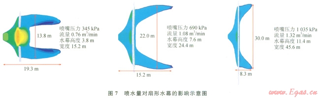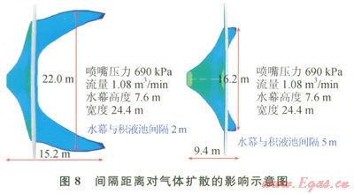 下面對(duì)扇形水幕的參數(shù)進(jìn)行研究,包括噴水量和水幕和擴(kuò)散源之間的間隔,這二者是影響水幕阻擋效果的主要因素。圖7顯示了不同水流量下,水幕對(duì)氣體擴(kuò)散的影響,在相同的大氣條件下,水流量越大,形成的水幕尺寸也就越大。當(dāng)扇形水幕流量為l.32m3/min,壓力1035kPa時(shí),水幕高度為11.4m,寬度45.6m,LNG蒸發(fā)氣體下風(fēng)向擴(kuò)散的安全距離為8.3m。
