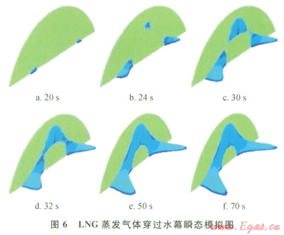 以穩(wěn)態(tài)速度場(chǎng)為初始條件,打開(kāi)泄漏源,開(kāi)始做瞬態(tài)計(jì)算,擴(kuò)散云團(tuán)與時(shí)間的依賴關(guān)系見(jiàn)圖6。圖6中所示為體積濃度2.5%的等濃度面,t=0時(shí),擴(kuò)散開(kāi)始,并保持LNG液體在積液池內(nèi)蒸發(fā)速率恒定[0.12kg/(m2·s)]??梢杂^察到,大約t=20s時(shí),擴(kuò)散氣體已經(jīng)到達(dá)水幕位置,并開(kāi)始穿越水幕,由于LNG擴(kuò)散氣體的重氣效應(yīng),側(cè)風(fēng)向尺寸較大,而豎直高度較小,同時(shí),水幕的阻力系數(shù)沿徑向變化,距離中心點(diǎn)越遠(yuǎn),阻力系數(shù)越小,所以擴(kuò)散氣體在穿透水幕時(shí),先從水幕的邊緣處開(kāi)始,然后從頂部開(kāi)始,逐漸向水幕的噴射中心點(diǎn)處靠攏,隨著時(shí)間的延長(zhǎng)(大約t=50s時(shí)),水幕場(chǎng)景下的擴(kuò)散到達(dá)穩(wěn)態(tài),并保持云團(tuán)尺寸不變(該處云團(tuán)尺寸指體積濃度為2.5%的等濃度面),下風(fēng)向擴(kuò)散距離l3.2m,側(cè)風(fēng)向擴(kuò)散距離20.0m。