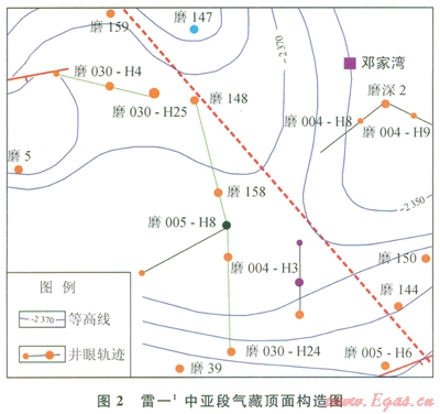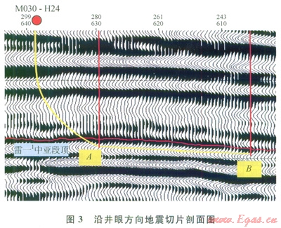 030-H24井井眼軌跡方向上已完鉆的磨39、158147井連線顯示,雷一1中亞段氣藏的頂面深度在海拔-2370m附近(2),磨39井位于構(gòu)造低點附近。設計井眼方向(近正南方)造斜著陸井段和水平段前段構(gòu)造較為平緩,但水平段后段構(gòu)造相對變陡。磨030-H24井井眼方向的三維地震切片剖面(3),通過剖面分析看出,著陸井段所處位置地層平緩,傾角近于水平,實鉆過程中可能不會出現(xiàn)較大的地層傾角變化。