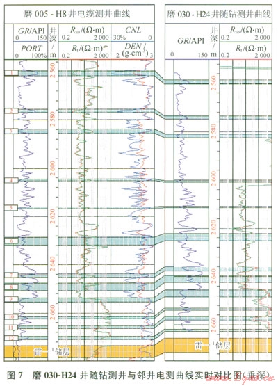 1是磨溪氣田磨030-H24井的隨鉆測井與電纜測井伽馬和電阻率曲線的對比圖,從圖l中可以看出隨鉆測井與電纜測井伽馬和電阻率值均具有良好的相關性,曲線形態(tài)相同,對比性好,但電阻值由于標定及測量環(huán)境不同的原因,值的大小有一定差異。值得注意的是由于感應電阻率主要應用于低電阻率地層,在電阻率較低時具有較高的測量精度,當?shù)貙与娮杪食^較高(大于l00W·m)時,測量精度下降,曲線容易發(fā)生畸變,如圖l中高電阻率地層隨鉆電阻率較大幅度低于電纜測井電阻率,因此在實際應用時應特別注意其對分層造成的不利影響。
