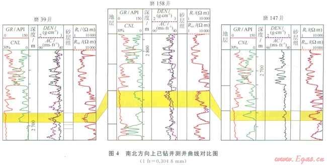4為磨39、158井和l47井的測井曲線解釋的云巖儲層,有效厚度約6m,儲層分布穩(wěn)定。儲層特征主要如下:巖性為針孔白云巖、自然伽馬值較低在2030API、電阻率處于相對低值l0300W·m。儲層上部為泥質(zhì)云巖、泥質(zhì)灰?guī)r和膏巖,特別是儲層上部有約2m垂厚的石膏,其伽馬特征為低值在9API左右,電阻率大于2000W·m,且?guī)r屑錄井上也很好區(qū)分。綜上所述,磨030-H24井連井剖面曲線對比特征及巖性差異明顯,追蹤性強,這些特征可用于鉆井井眼軌跡進入儲層頂準確著陸的技術控制。