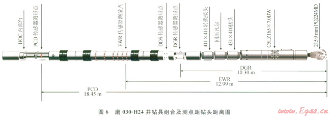 電阻率測井是利用不同的巖性、物性及含流體性質(zhì)的巖石具有不同的導電特性的方法來確定巖性、劃分油氣水層和計算含油氣飽和度的一類測井方法。隨鉆電阻率測井一般采用的是感應電阻率測井,FEWDEWR—PHASE4感應電阻率傳感器采用的是四發(fā)雙收結(jié)構(gòu)具有信息量大、探測深度大的特點,儀器測量范圍0.052000W·m、測量精度在±1(地層電阻率10W·m)、垂直分辨率l52.4mm、探測深度可達1.9m[5]。磨溪氣田雷口坡組地層電阻率大部分在2200W·m,部分超過2000W·m,EWR-PHASE4基本能滿足測量的需要。