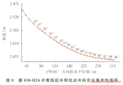 5)鉆進至斜深2754m(垂深2659.5m)時,根據(jù)曲線對比,預計后續(xù)地層不會有太大的變化。經(jīng)過重新進行軌跡優(yōu)化設計后,考慮到垂深26632665m為石膏層,井眼軌跡將需要穿越約20m斜深的石膏層(該石膏層定向容易粘卡,該地區(qū)如磨030-H30井等多口井在此層段定向時發(fā)生過卡鉆事故),且此時鉆井液密度已高達2.02gcm3。因此經(jīng)綜合考慮,將造斜率提高至7°30m8°30m,提前將井斜增至80°,這樣下部井段造斜率要求僅需不到4°30m,考慮到復合鉆進自然增斜率3°30m4°30m。因此下部僅需少量定向增斜即可達到要求,極大地降低了在石膏層中定向造斜所帶來的風險。