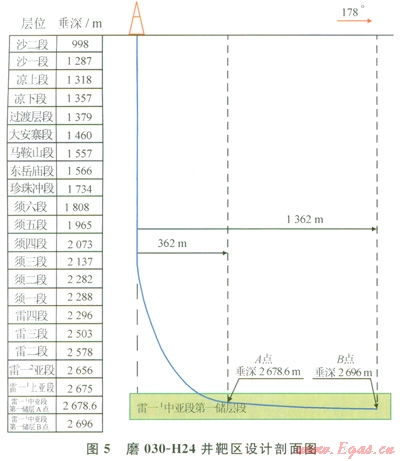 根據(jù)本井鄰井儲層深度、厚度、地層傾角變化分析,地質(zhì)提出了本井井眼軌跡基本要求:以井口為原點,定向方位178°,靶前位移362m時進入A點,在雷一1中亞段第一儲層完成水平段長1000m,設計全井井深(斜深)3890m(3、5)。