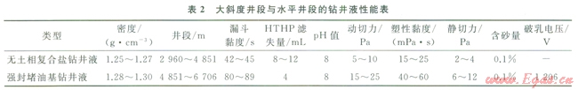 該井Æ215.9mm井段采用無(wú)土相復(fù)合鹽鉆井液體系,通過(guò)加入無(wú)機(jī)鹽和有機(jī)鹽提高體系抑制性[9]。在井斜角30°、45°、60°時(shí)需調(diào)整控制鉆井液的密度;通過(guò)增加陽(yáng)離子乳化瀝青粉和細(xì)目碳酸鈣的含量,提高封堵性來(lái)降低地層的坍塌壓力;嚴(yán)格控制鉆井液的濾失量,要求APl濾失量控制在2mL以內(nèi),該體系抑制性強(qiáng)、固相含量比較低(表2),性能穩(wěn)定,有效提高機(jī)械鉆速[10]。