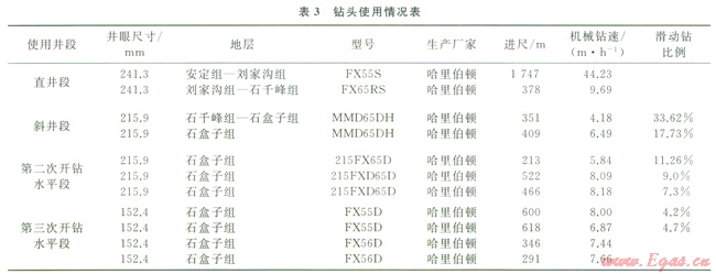 該井第二次開鉆的Æ241.3mm+Æ215.9mm井眼全部采用PDC鉆頭,直井段穿越多個(gè)層位,劉家溝組以上地層平均巖石可鉆性為3級(jí),且波動(dòng)范圍較小,相對(duì)均質(zhì);劉家溝組以下井段鉆遇地層富含礫砂巖、含礫中粗粒石英砂巖,平均研磨性指數(shù)為6[11]。地層軟硬交錯(cuò)比較嚴(yán)重,巖石可鉆性及抗壓強(qiáng)度波動(dòng)范圍較大。根據(jù)地層巖性,優(yōu)選不同的鉆頭型號(hào),有效地提高了鉆井速度(表3)。