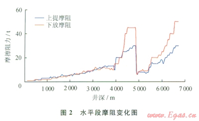 在長(zhǎng)水平段水平井鉆井過(guò)程中,由于鉆具與井壁底部形成的巖屑床相互作用,鉆井液固相含量高導(dǎo)致潤(rùn)滑效果下降等[4]原因,鉆具與井壁之間的摩擦阻力隨著水平段長(zhǎng)度的增加而不斷增大,影響水平段鉆進(jìn)長(zhǎng)度。根據(jù)常規(guī)水平井實(shí)鉆分析,裸眼內(nèi)摩擦系數(shù)比套管內(nèi)摩擦系數(shù)大。Æ215.9mm井眼的水平段鉆至4851m,鉆水平段長(zhǎng)度1200m,下Æ177.8mm套管固井。根據(jù)現(xiàn)場(chǎng)施工獲得的扭矩、摩阻數(shù)據(jù)分析(圖2、3),通過(guò)優(yōu)化井身結(jié)構(gòu),有效降低了長(zhǎng)水平段施工過(guò)程中的摩阻系數(shù),提高了施工效率。