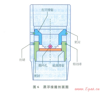 為了順利將Æl77.8mm套管下入長(zhǎng)1200m的Æ215.9mm井眼內(nèi),在套管串中應(yīng)用了漂浮接箍(圖6)。漂浮接箍上部的套管柱灌入鉆井液,下部的套管內(nèi)部充滿空氣(沒(méi)有鉆井液),漂浮接箍下部套管入井后受到鉆井液的浮力作用降低了井壁對(duì)套管柱的摩擦阻力;而漂浮接箍上部的套管內(nèi)灌有鉆井液會(huì)增加套管柱的重量,確保套管順利入井。下到預(yù)定深度后向套管內(nèi)加壓,直到扣‘開滑套向下移動(dòng)讓鉆井液與空氣進(jìn)行交換。當(dāng)流動(dòng)穩(wěn)定后,整個(gè)套管柱內(nèi)都充滿了鉆井液投入下膠塞,注入水泥漿,浮鞋盲板打開。當(dāng)下膠塞坐定在滑套上后,剪斷銷釘,水泥漿就把下膠塞和漂浮接箍的兩個(gè)滑套一起下推向下部的浮箍下膠塞和兩個(gè)滑套坐定在浮箍上,并與浮箍密封。下膠塞破裂,水泥漿通過(guò)浮鞋泵出,頂替上膠塞,并與浮箍處的下膠塞和漂浮接箍組件形成密封,確保固井質(zhì)量。