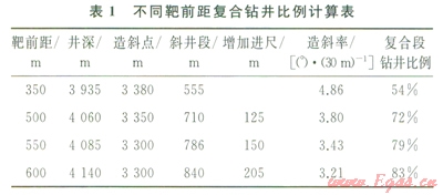 合理的靶前距可有效提高復(fù)合鉆井段比例,最大限度增加PDC鉆頭的使用井段,有助于提高機(jī)械鉆速;另外,合理的靶前距還可帶來最佳的造斜率,降低鉆具摩阻,有利于提高鉆井速度。總結(jié)水平井施工經(jīng)驗(yàn),推薦合理靶前距:水平段長度小于l000m,靶前距350~400m;水平段長度l000~1500m,靶前距400~450m;水平段長度大于l500m,靶前距450~500 m(表1)。