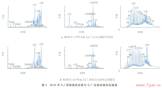 1)氣源分析發(fā)現(xiàn),川西坳陷T2l頂部風(fēng)化殼氣藏氣源主要來(lái)自于T2l渦湖相的“富藻碳酸鹽巖烴源巖”:CKl井3個(gè)氣樣分析結(jié)果顯示,T2l滅然氣中含H2S,(H2S含量介于0.39%~0.68%),天然氣碳同位素值有別于陸相上三疊統(tǒng)須家河組和侏羅系,表現(xiàn)出典型的油型氣特征;同時(shí),XCSl井T2l頂部?jī)?chǔ)層瀝青與蒸發(fā)巖之下“富藻碳酸鹽巖烴源巖”生物標(biāo)記化合物特征表現(xiàn)出很高的相似性,均具有低孕甾烷、規(guī)則甾烷呈“V”形、三環(huán)萜烷含量小于五環(huán)萜烷、色譜呈雙峰的特征(圖2)。
