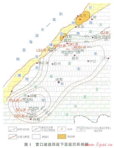 四川盆地海域在三疊紀(jì)雷口坡期(T2l)沉積時(shí)主要為陸表海斷續(xù)淹沒(méi)的蒸發(fā)臺(tái)地,由于受周邊造山帶構(gòu)造隆升、擠壓的影響,尤其受東南面江南古陸的隆升、臺(tái)內(nèi)瀘州—開(kāi)江水下隆起形成的影響,該蒸發(fā)臺(tái)地內(nèi)形成次一級(jí)的隆凹,這些隆凹形成蒸發(fā)巖臺(tái)地內(nèi)渴湖、咸化鹽湖的基底。川西地區(qū)中三疊世雷口坡晚期膏鹽巖湖盆主要分布在邛崍—成都—德陽(yáng)一帶(圖1),發(fā)育多套碳酸鹽巖、石膏、硬石膏巖及鹽巖的旋回沉積。