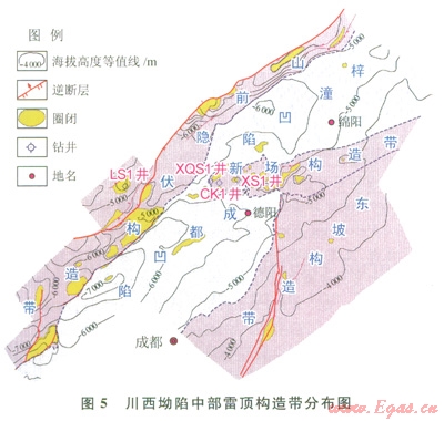 地震資料解釋發(fā)現(xiàn)在川西坳陷的新場(chǎng)構(gòu)造帶、鴨子河隱伏構(gòu)造帶、坳陷東斜坡構(gòu)造帶內(nèi)雷口坡組構(gòu)造層還發(fā)育眾多次級(jí)構(gòu)造和層圈閉,構(gòu)造圈閉條件較好;另外,地震預(yù)測(cè)川西坳陷雷頂風(fēng)化殼有利儲(chǔ)層發(fā)育區(qū)面積達(dá)4000km2,遠(yuǎn)大于現(xiàn)今雷頂局部構(gòu)造圈閉面積的總和。因此雷頂風(fēng)化殼還具有存在巖性圈閉氣藏的可能。