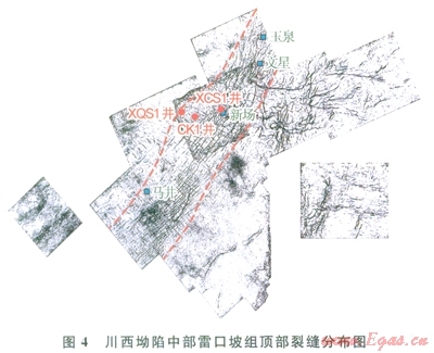 伴隨印支中晚期以來(lái)龍門(mén)山造山帶的隆升推覆、多期次由西向東強(qiáng)烈擠壓,使川西地區(qū)雷頂風(fēng)化殼層還受到了構(gòu)造裂縫及由構(gòu)造形變而產(chǎn)生的熱液流動(dòng)等因素的影響,重新形成在深埋條件下的“孔縫洞體系”。目前,在川西坳陷中部,用三維地震曲率法預(yù)測(cè)出在雷頂風(fēng)化面上明顯發(fā)育一組NE走向、寬約20km、長(zhǎng)約75km、裂縫密度達(dá)22.33條/km2的網(wǎng)狀裂縫帶,裂縫向上延伸到小塘子組,向下延伸到雷四中下亞段,平面主要集中在文星、玉泉、新場(chǎng)、馬井一線(圖4)。分析認(rèn)為這組裂縫帶主要形成于印支晚期構(gòu)造運(yùn)動(dòng),裂縫帶發(fā)育與構(gòu)造形變及層內(nèi)膏鹽巖的塑性揉皺有關(guān),其可能對(duì)雷頂風(fēng)化殼巖溶儲(chǔ)層發(fā)育及溝通下伏層內(nèi)烴源起著十分重要的作用,CK1井和XCSl井發(fā)現(xiàn)的風(fēng)化殼氣藏都位于裂縫發(fā)育帶內(nèi)。