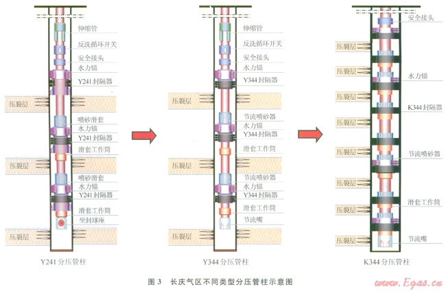 通過(guò)優(yōu)化井身剖面和“四合一”鉆具組合[12],實(shí)現(xiàn)小位移井“1~2趟鉆”,大位移(超過(guò)850m)井“2~3趟鉆”,提高了鉆井效率。平均鉆井周期21.7d,最短鉆井周期l3d;平均水平位移914.5m,最大位移達(dá)到1400m。建立“設(shè)計(jì)四防碰,施工三預(yù)防,空間三繞障”防碰繞障理論體系,采用軌跡空間球面掃描方法,模擬井身軌跡空間展布與安全井間距曲線。分層改造取得重要進(jìn)展,通過(guò)分壓管柱優(yōu)化,由早期Y241分壓管柱優(yōu)化為目前的K344分壓管柱(圖3),實(shí)現(xiàn)了一次連續(xù)分壓8層的新突破。2012年機(jī)械封隔分壓5層以上現(xiàn)場(chǎng)試驗(yàn)39口井,平均試氣產(chǎn)量10.93×104m3/d。