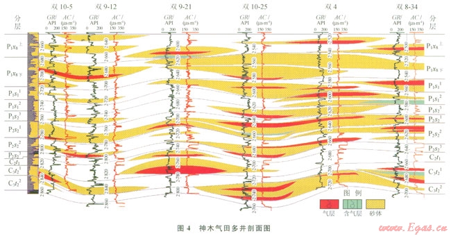 神木氣田具有多層系含氣特征(圖4),并且和煤田高度重疊,開發(fā)難度較大,叢式井鉆完井技術(shù)進(jìn)步顯著提高了神木氣田開發(fā)水平。2012年神木氣田完鉆124口井,其中5口井以上的叢式井組14個(gè)85口井,最大叢式井組轄井11口,完試46口,平均無(wú)阻流量12.35×104m3/d。