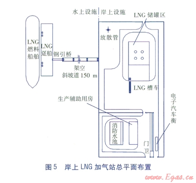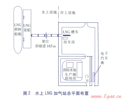 該方案是將LNG的裝卸、儲存及配套的供電、消防、控制設施設在岸上的LNG站區(qū)內,水上的躉船上不設LNG儲罐,只設LNG加氣機、加氣臂等加氣設施,進行岸上儲存、船上加氣作業(yè)。