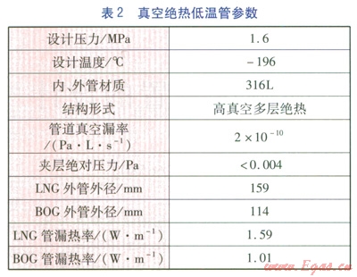 架空斜坡道上的LNG輸送管道內管為公稱直徑80mm的真空絕熱低溫管道,BOG管道內管為公稱直徑50mm的真空絕熱低溫管道。真空絕熱低溫管參數(shù)見表2。