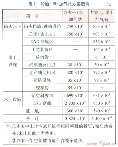 結合上述水上LNG加氣站方案、岸上LNG加氣站方案的建設內容,對兩個方案進行技術經(jīng)濟比較。船舶LNG加氣站方案造價見表1。