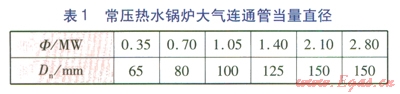 根據(jù)式(1)可計(jì)算出各種規(guī)格的常壓熱水鍋爐必須配備的大氣連通管的當(dāng)量直徑,圓整至公稱(chēng)直徑,見(jiàn)表l。