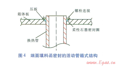 為降低成本,經(jīng)過分析研究,決定選用抗腐蝕性能高且價格低的復合管材——20號鋼管外表面鍍搪瓷,采用端面填料函密封的活動管箱式結(jié)構(gòu)(見圖4)。
