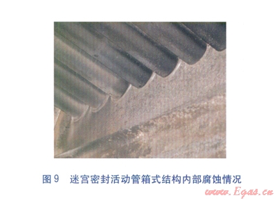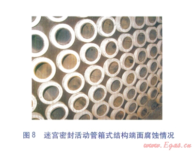 經(jīng)研究,認為采用非金屬材料的迷宮密封結(jié)構(gòu)可以有效消除縫隙腐蝕的發(fā)生,迷宮密封活動管箱式結(jié)構(gòu)見圖7。鍍搪瓷鋼管穿入迷宮密封套中(內(nèi)環(huán)面加工有迷宮鋸齒槽),迷宮鋸齒槽與鋼管外表面形成若干道迷宮腔,從而實現(xiàn)了密封。迷宮密封活動管箱式結(jié)構(gòu)不但具有端面填料函密封的活動管箱式結(jié)構(gòu)的優(yōu)點,還由于換熱管與箱體板之間有柔性迷宮密封套隔離,避免了在安裝、運行過程中對搪瓷層的破壞,從本質(zhì)上消除了縫隙腐蝕的發(fā)生[5]。經(jīng)技術(shù)改造后的空氣預熱器,連續(xù)運行2年后運行狀況依然良好,箱體板及換熱管各部位基本上沒有發(fā)生腐蝕(見圖8、9)。