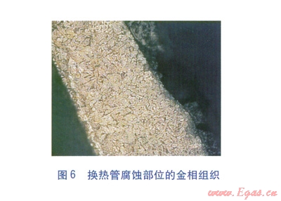 鍍搪瓷鋼管穿入箱體板中,壓板擠壓柔性石墨密封圈,以填充箱體板與換熱管間的填料函起到密封作用。與整體焊接的固定管箱式結(jié)構(gòu)相比,這種結(jié)構(gòu)一是可以削弱換熱管根部承受的交變應力,二是可有效避免焊接導致的管道抗腐蝕性能的降低。經(jīng)過技術(shù)改造,使用壽命提高到l0~12個月。雖然技術(shù)改造后空氣預熱器的使用壽命有了一定延長,但效果仍不理想。通過現(xiàn)場勘察,技術(shù)改造基本杜絕了換熱管主體的酸露點腐蝕,腐蝕主要發(fā)生在換熱管與箱體板、柔性石墨密封圈接觸的部位(見圖5)。通過對換熱管腐蝕部位的金相組織(見圖6)分析發(fā)現(xiàn),腐蝕成因為典型的縫隙腐蝕[3-4]。