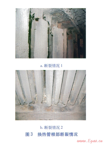 根據(jù)以上分析,課題小組選用抗腐蝕性能較高的ND鋼(09CrCuSb)對換熱管進行改造,仍采用整體焊接的固定管箱式結(jié)構(gòu)。但改造后,5~10個月?lián)Q熱管根部再次出現(xiàn)了斷裂。不但使用壽命沒有有效延長,而且由于ND鋼的價格較高,導致成本急劇增加。