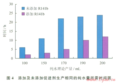 為了更清楚地了解Rl41b促進劑對CO2水合物海水淡化效率的影響,筆者對比了兩組實驗的相同理論純水產量所需的時間,結果見圖4。從圖4中可看出,生產相同量的純水,不添加Rl41b的實驗所需時間為添加Rl4lIJ的2~4倍。