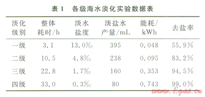 本研究選用的是青島周邊海域的海水,其鹽度為29.5‰±0.5‰。筆者共進行了四級海水淡化實驗,表1為一到四級海水淡化的實驗數(shù)據(jù)。由表1中數(shù)據(jù)可知,隨著淡化級數(shù)的不斷增加,淡化水的鹽度不斷降低,從一級淡化水的l3.0‰,到四級淡化水的0.3‰;相應地,去鹽率從一級淡化水的55.5%,到四級淡化水的99.0%,淡化水產量卻從395mL降到了80mL。三級淡化是收集所有的二級淡化水后進行的,而四級淡化則是收集三次淡化水后進行的。因此,其整體能耗及時間應該累加,可以看出,雖然三級淡化和四級淡化所得到的淡化鹽度較低,但是,所需要的時間和能耗也非常高,四級淡化水需要時間為33h,能耗達到了0.743kWh。