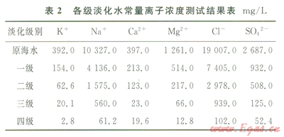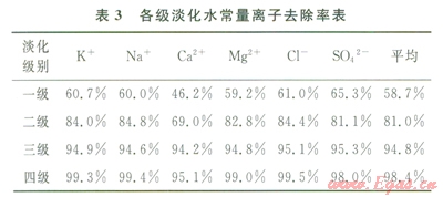 2)對本方法的海水淡化程度進行了分析,海水經過多級淡化,可以獲得了凈化度很高的淡水。在二級淡化水中,常量離子去除率平均可達81.0%,而三級和四級淡化水的離子去除率則分別達到了94.8%和98.4%,四級淡化水所有的離子濃度指標均優(yōu)于飲用水標準。