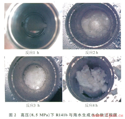 為了考察Rl4lb在深海中(有一定的壓力)與海水生成水合物的過程,筆者選用氮氣作為增加環(huán)境壓力的氣體,主要南于氮氣水合物極難生成。將反應釜的溫度設為2℃,加入240 ml。海水及6mL的R141b,密封反應釜。通入氮氣至壓力為8.5MPa,調節(jié)攪拌子速率為400r/min,進行水合物生成反應,每小時用相機記錄下水合物反應情況。圖2為觀測到的R14lb水合物生成過程,可以看出,在4h內水合物大量生成,遠遠低于在常壓下的反應時間,說明在高壓下R141b可很快地與海水生成水合物。在反應過程中,釜內壓力不變,依然為8.5MPa,說明氮氣沒有參與水合物的生成反應。