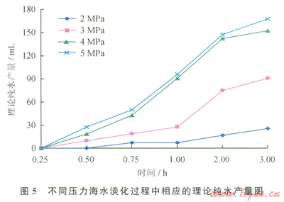 反應壓力與理論純水產量的關系見圖5。由圖5可看出,理論純水產量隨著壓力的升高而不同程度地升高。4MPa環(huán)境壓力的純水產量較2MPa、3MPa有明顯升高,雖然5MPa的純水產量為最高,但是效果與4MPa環(huán)境壓力相差不大。從實驗中可知,環(huán)境壓力4MPa左右可獲得較高的海水淡化效率,同時成本也不會太高??紤]到海水深度可提供1MPa左右的環(huán)境壓力。因此,可選定CO2氣體的初始壓力為3~4MPa.