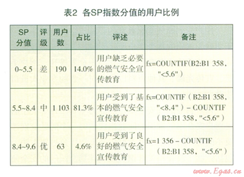采用countif(range,criteria)統(tǒng)計(jì)程序,按燃?xì)庵R(shí)教育強(qiáng)度(SP)評(píng)級(jí),對(duì)有效問卷的l 357位用戶進(jìn)行分類統(tǒng)計(jì)得出表2統(tǒng)計(jì)結(jié)果: